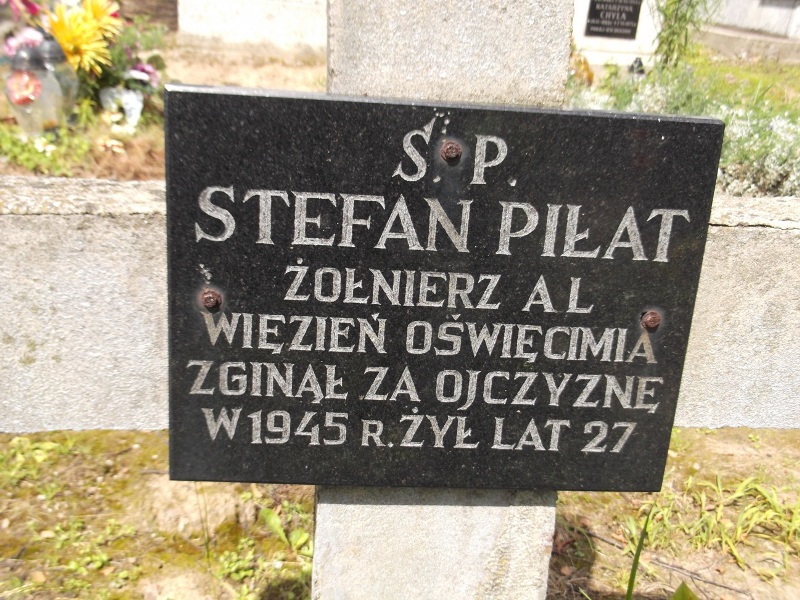 Mogiła ziemna w betonowym obramowaniu, u wezgłowia betonowy krzyż z prostokątną tablicą z napisem: „Ś.P./ STEFAN PIŁAT/ ŻOŁNIERZ AL/ WIĘZIEŃ OŚWIĘCIMIA/ ZGINĄŁ ZA OJCZYZNĘ/ W 1945 R. ŻYŁ LAT 27”.