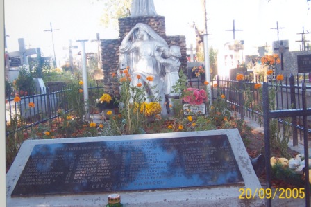 Mogiła ziemna, założona na planie prostokąta i otoczona płotem z metalowych prętów na betonowej podmurówce. U wezgłowia mogiły znajduje się wysoki postument ze spojonych zaprawą otoczaków, zwieńczony figurą Chrystusa. Przed frontową ścianą postumentu umieszczone są dwie figury przedstawiające postacie kobiety i dziecka. Po obu stronach postumentu znajdują się kwietniki na wysokich filarach z metalowych rur.