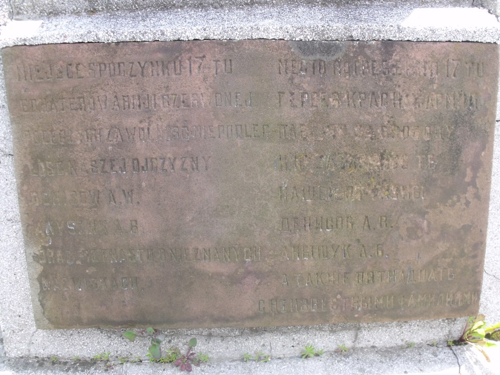 We frontową ścianę postumentu wmurowana jest tablica z inskrypcją w języku rosyjskim i polskim: „MIEJSCE SPOCZYNKU 17-TU/ BOHATERÓW ARMII CZERWONEJ/ POLEGŁYCH ZA WOLNOŚĆ I NIEPODLEG-/ ŁOŚĆ NASZEJ OJCZYZNY/ DENISOW A.W/ ANYSZUK A.B./ ORAZ PIĘTNASTU O NIEZNANYCH/ NAZWISKACH.