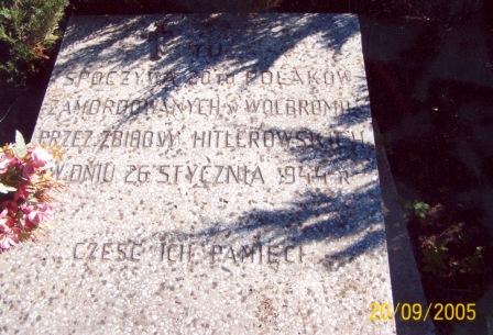 26 stycznia 1944 r. w Wolbromiu Gestapo rozstrzelało 20 osób. W dniu 5 kwietnia1945 r. zwłoki pomordowanych ekshumowano i pochowano w mogile zbiorowej na cmentarzu parafialnym w Wolbromiu. W upamiętnionym pomnikiem miejscu egzekucji znajduje się tablica z nazwiskami ofiar.