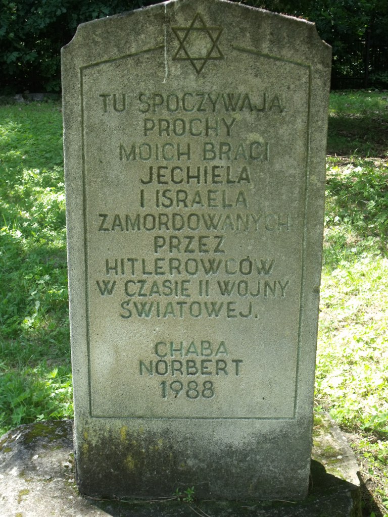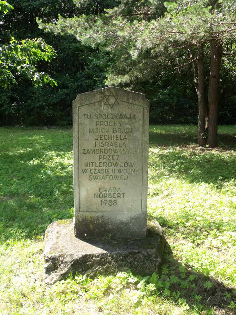 Na mogile znajduje macewa z wyrytą Gwiazdą Dawida i napisem: „TU SPOCZYWAJĄ/ PROCHY/ MOICH BRACI/ JECHIELA/ I ISRAEL/ ZAMORDOWANYCH/ PRZEZ/ HITLEROWCÓW/ W CZASIE II WOJNY/ ŚWIATOWEJ/ CHABA NORBERT/ 1988”. Na cmentarzu znajduje się również pomnik upamiętniający 4500 mieszkańców Wolbromia narodowości żydowskiej zamordowanych w okresie II wojny światowej”.