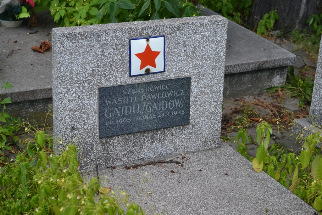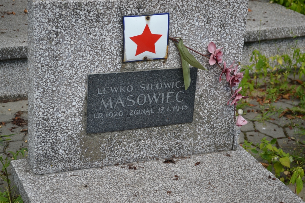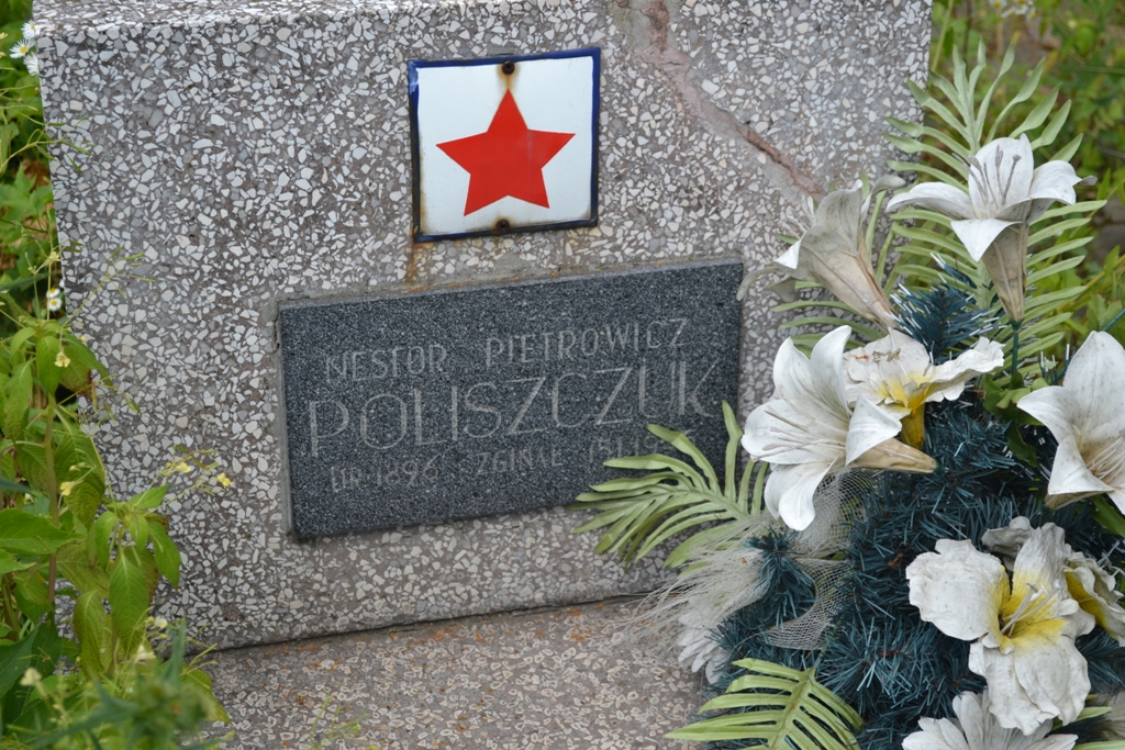 U wezgłowia jednego z grobów zamiast steli znajduje się betonowy obelisk z wyrytą pięcioramienną gwiazdą na frontowej ścianie, umieszczony na dwustopniowym postumencie. Na licu postumentu umieszczona jest tablica w języku rosyjskim: „Офицер Красной Армии Старшый Леитенаит/ Корбут Иван Антонович/ родился 23 Августа 1903 г. в городе киев/ погиб 29 марта 1945 года/ при исполнении служебных обязанностей/ на должности помощника военного/ коменанта города Мехув/ спи наш воевой друг товарищ!/ Память мы о тебе сохраним”.