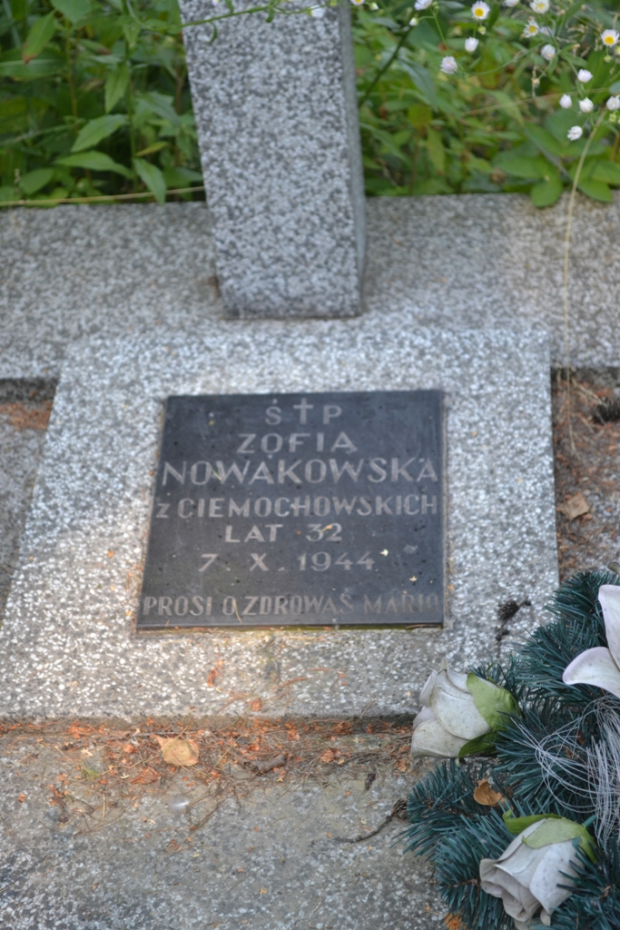 Na mogile znajduje się lastrykowy nagrobek z krzyżem łacińskim u wezgłowia i tablicą z ciemnego kamienia z napisem: „Ś.†P./ ZOFIA/ NOWAKOWSKA/ z CIEMIOCHOWSKICH/ LAT 32/ 7.X.1944/ PROSI O ZDROWAŚ MARIO”.