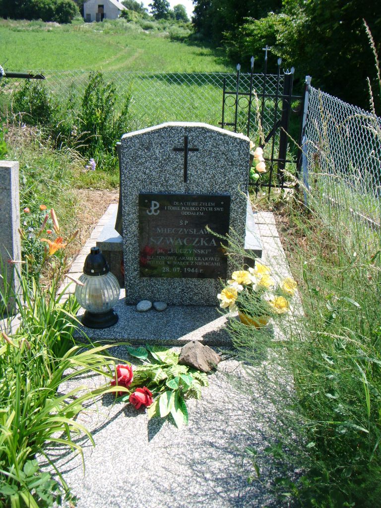 Lastrykowy nagrobek ze stelą o ściętych narożach u wezgłowia. Na steli umieszczony jest krzyż, tablica z symbolem Polski Walczącej i napisem: „DLA CIEBIE ŻYŁEM/ I TOBIE POLSKO ŻYCIE SWE/ ODDAŁEM../ Ś P/ MIECZYSŁAW/ SZWACZKA/ ps. „ŁUCZYŃSKI”/ PLUTONOWY ARMII KRAJOWEJ/ POLEGŁ W WALCE Z NIEMCAMI/ 28.07.1944 r.”