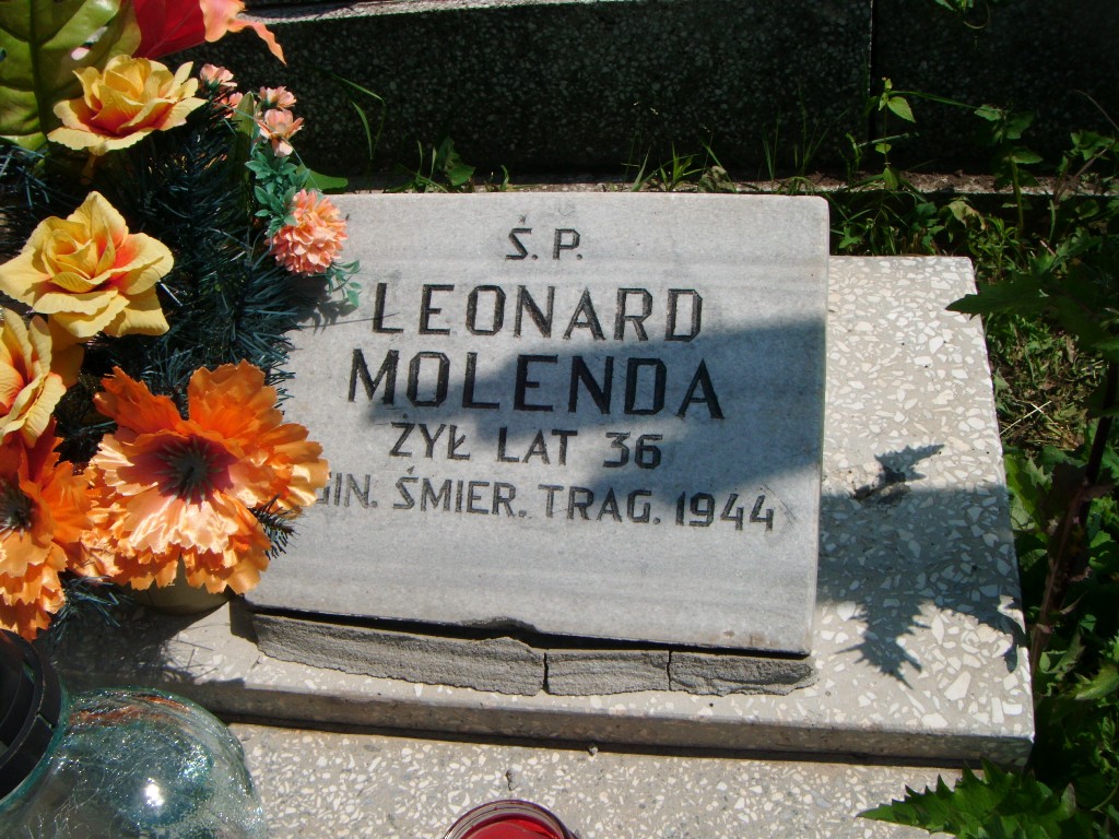 Mogiła obramowana, nakryta lastrykową płytą, u wezgłowia ścięta pulpitowo stela z inskrypcją „Ś.P. LEONARD/ MOLENDA/ ŻYŁ LAT 36/ ZGIN. ŚMIER. TRAG. 1944”.