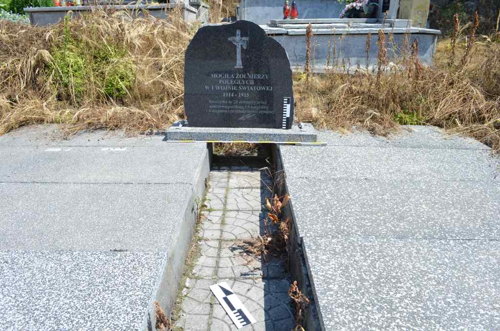 Kwatera złożona jest na planie nieregularnego wieloboku. Składa się z dwóch części. Pierwszą z nich stanowią dwie prostokątne, podłużne mogiły w betonowych obramowaniach, nakryte lastrykowymi płytami. Połączone są one płytą, na której ustawiona jest stela o nieregularnych krawędziach z wyrytym krzyżem oraz napisem: „MOGIŁA ŻOŁNIERZY/ POLEGŁYCH/ W I WOJNIE ŚWIATOWEJ/ 1914 – 1915/ Spoczywa tu 25 żołnierzy armii/ austro-węgierskiej i 8 rosyjskiej/ i 4 nieznanej przynależności armijnej.” Drugą część kwatery stanowi prostokątna mogiła w betonowym obramowaniu, nakryta lastrykową płytą z lastrykową stelą u wezgłowia. Na steli umieszczona jest tablica z motywem gałązki palmowej oraz napisem: „MOGIŁA ŻOŁNIERZY/ POLEGŁYCH W I WOJNIE ŚWIATOWEJ/ 1914-1915”.
