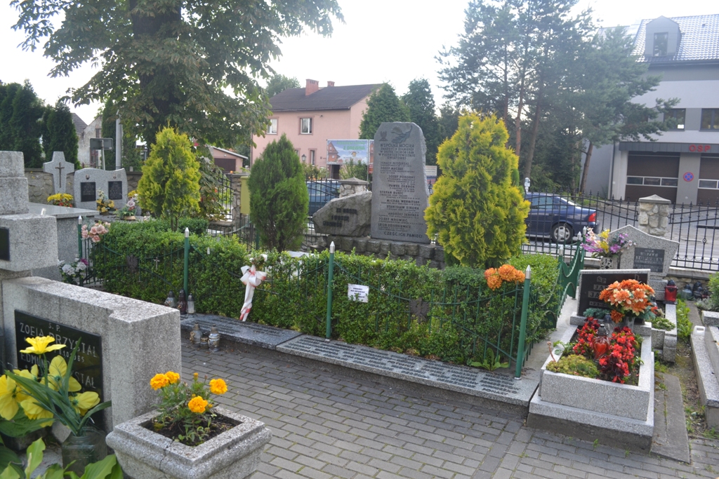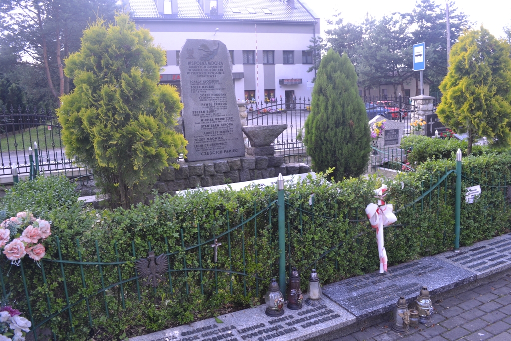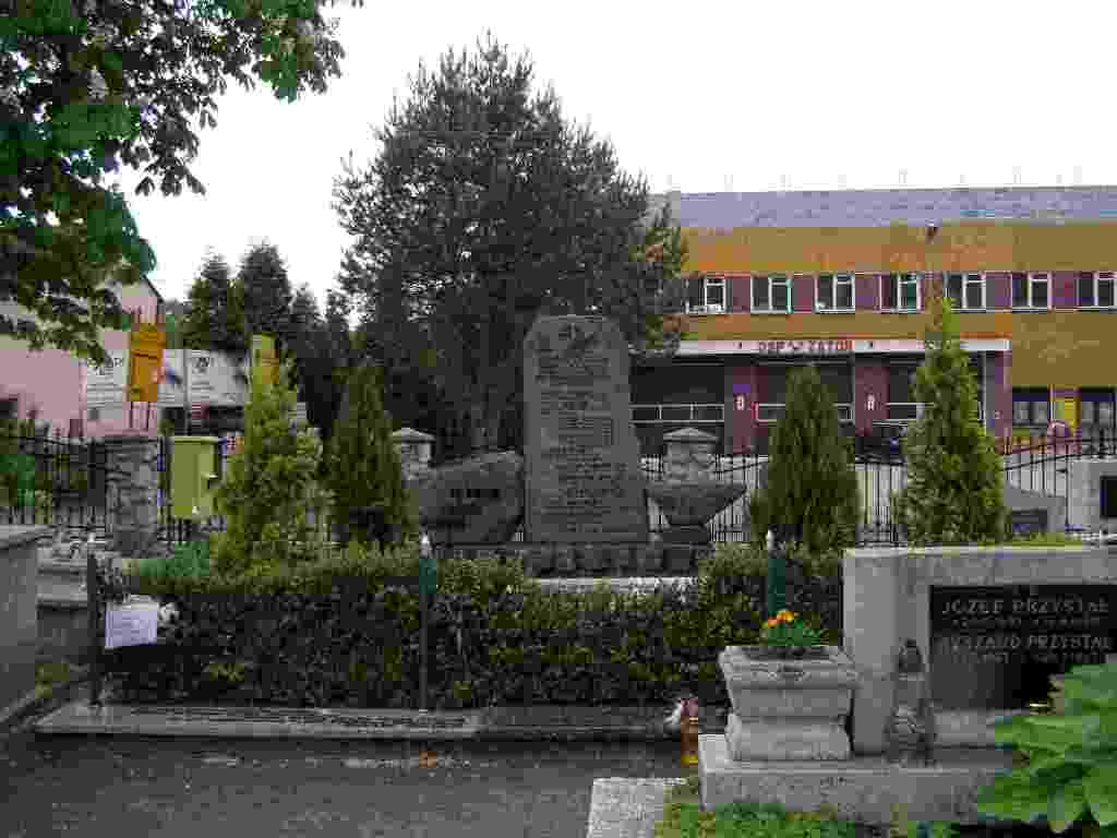 Na głazie pamiątkowym znajduje się napis z metalowych liter: „ZA NASZĄ/ I WASZĄ/ WOLNOŚĆ”. Na steli umieszczone są dwie metalowe plakietki w formie orła w koronie i liścia oraz napis: „WSPÓLNA MOGIŁA/ ZMARŁYCH ŻOŁNIERZY/ W SKUTEK CHORÓB I RAN/ W PIERWSZEJ WOJNE/ ŚWIATOWEJ/ IGNACY KŁOSIŃSKI/ Z WOLBROMIA + 28- 2-1915/ JÓZEF MACZAK / Z HRUSTIN POW. WANESTE WĘGRY/ +10-3-1915/ JÓZEF POKORNY/ Z ROŻNOWIC – CZECHOSŁO/ -WACJA ŻOŁNIERZ 8 P.P./ + 2-3-1915/ PAWEŁ ŻEBROK/ Z CIESZYNA 31 P. OBR./ KRAJ + 12-5-1915/ STEFAN BUKIC/ Z MOŚCISK POW – KAŁUSZ/ ŻOŁNIERZ 4 P. UŁAN – 13 5 – 1915/ MICHAŁ WERNITZER/ ŻOŁNIERZ 32 P. OBR. KRAJ - + 16 5-1915/ STANISŁAW SIKORA/ Z WODNEJ POW – CHRZANÓW/ 30-3-1919/ ANDRZEJ JENKNER/ Z LIPNIKA POW – BIAŁA KRAK +3-4-1919/ JÓZEF MROWIEC/ Z PIETRZYKOWIC POW. ŻYWIEC + 22-4-1919/ LEON DZIURKIEWICZ/ Z ZATORA + 22-10-1919/ I DWAJ NIEZNANI ŻOŁNIERZE/ CZEŚĆ ICH PAMIĘCI”. Po prawej stronie steli znajduje się kamienna donica.