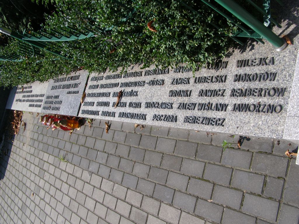 Na frontowym obramowaniu umieszczone są napisy wykonane z metalowych liter zawierające nazwy miejsc i wydarzeń związanych z walką i męczeństwem Narodu Polskiego oraz cytatem z wypowiedzi gen. Władysława Andersa: „WESTERPLATTE HEL POCZTA GDAŃSKA/ MODLIN WARSZAWA KUTNO KOCK/ NARWIK TOBRUK LENINO MONTE CASSINO/ AKCJA „BURZA – WILNO – LWÓW POWSTANIE WARSZAWSKIE/ SIEKIERKI KOŁOBRZEG| JEŚLI O NICH ZAPOMNIMY/ NIECH BÓG ZAPOMNI O NAS/ GEN. ANDERS/ KOZIELSK – KATYŃ/ STAROBIELSK – CHARKÓW/ OSTASZKÓW – MIEDNOJE| BYKOWNIA KONIUCHY SKROBÓW/ AUSCHWITZ – BIRKENAU MAJDANEK TREBLINKA BRYGIDKI – LWÓW WILEJKA/ DACHAU BUCHENWALD MAUTHAUSEN – GUSEN ZAMEK LUBELSKI MOKOTÓW/ SACHSENHAUSEN RAVENSBRÜCK POTULICE WRONKI RAWICZ REMBERTÓW/ MAGADAN WORKUTA KOŁYMA UCHTA WŁOCŁAWEK ZALEW WIŚLANY JAWORZNO/ WŁADYWOSTOK NORYLSK KRASNOJARSK PECZORA BEREZWECZ PONARY”.