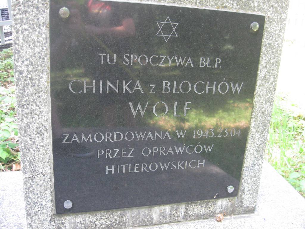 Mogiła obramowana i nakryta lastrykową płytą. U wezgłowia mogiły znajduje się prostokątna, lastrykowa stela z czarną tablicą z wyrytą Gwiazdą Dawida i napisem: „TU SPOCZYWA BŁ.P./ CHINKA z BLOCHÓW/ WOLF/ ZAMORDOWANA W 1943.23.04/ PRZEZ OPRAWCÓW/ HITLEROWSKICH”.