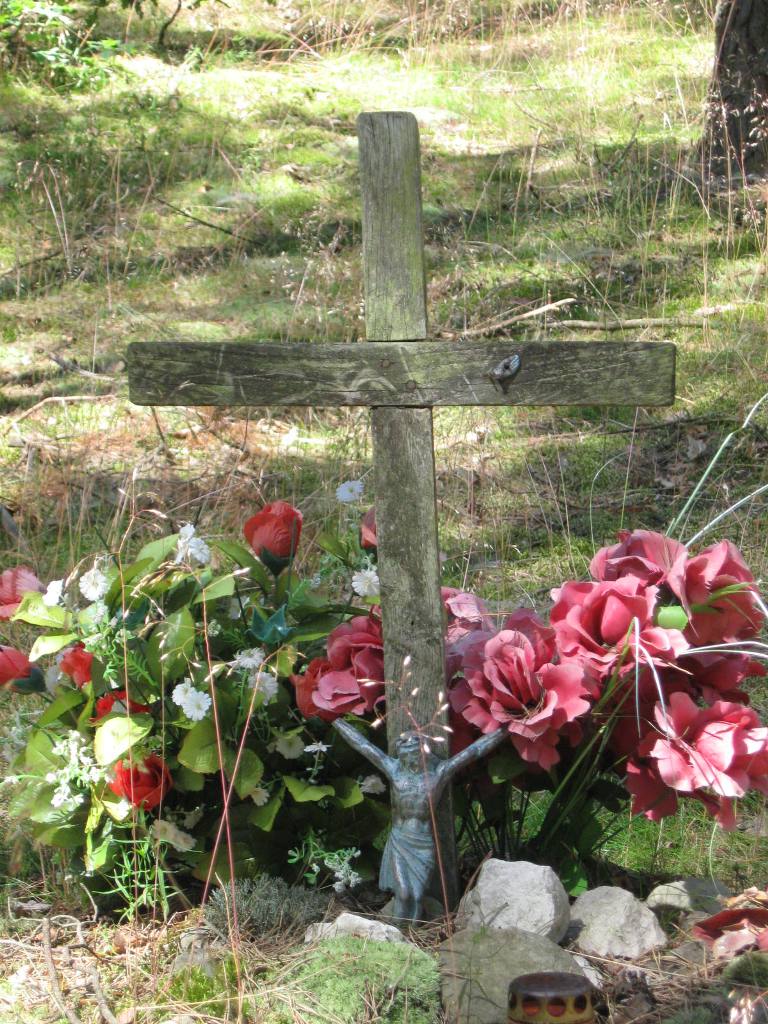 Mogiła ziemna, oznaczona drewnianym krzyżem.