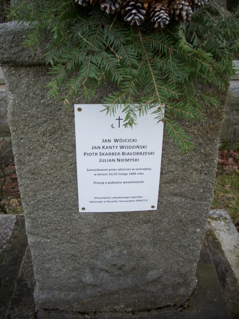 Na mogile znajduje się pomnik z piaskowca w formie postumentu, osadzonego na trójstopniowej, betonowej podstawie. Na frontowej ścianie postumentu umieszczona jest współczesna tabliczka z napisem: „Ś.✝P./ JAN WÓJCICKI/ JAN KANTY WODZIŃSKI/ PIOTR SKARBEK-BIAŁOBRZESKI, JULIAN NIEMYSKI/ Zamordowani przez włościan w Jastrzębiej/ w dniach 21/22 lutego 1846 roku/ Proszą o pobożne westchnienie/ (Pozostałości zabytkowego nagrobka opisanego w Roczniku Tarnowskim 2006/11)”. W dolnej części ścian pomnika umieszczone są płaskorzeźby przedstawiające czaszkę i skrzyżowane piszczele.