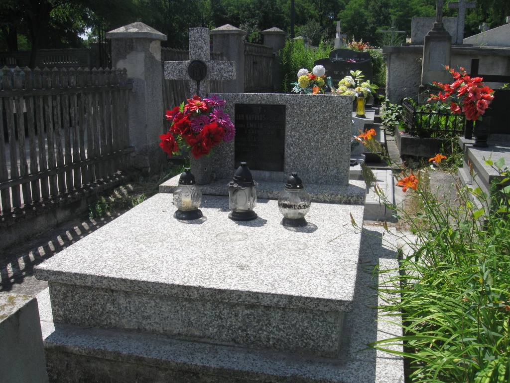 „Ś.✝P./JAN KAPINOS *2.IX.1902/ ŻONA EMILIA * 18.IV.1903./ z LACHUTÓW/ synek STASIU *4.VIII.1932/ ZMARLI TRAGICZNĄ ŚMIERCIĄ/ W CZASIE DZIAŁAŃ WOJENNYCH/ 10.VIII.1944/ PROSZĄ O WESTCHNIENIE DO BOGA”.