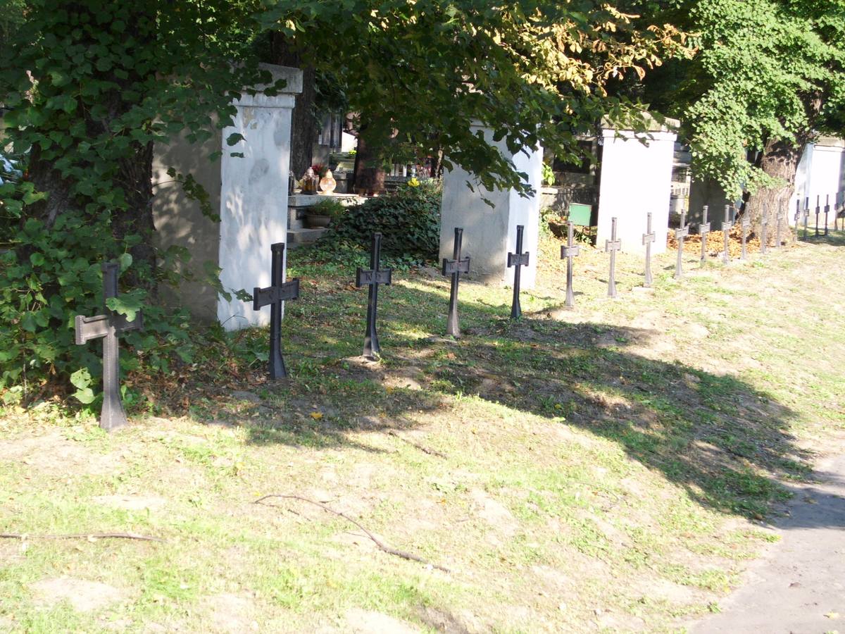 - gusseisernen durchbrochenen zweiarmigen und lateinischen Kreuzen (mit der Jahreszahl "1915" und ohne Jahreszahl), - gusseisernen Kreuzen mit einem Schild am Schnittpunkt der Arme, - geschmiedeten lateinischen Kreuzen (aus Flachstahl), - Steintafeln an der Zaunmauer in Betoneinfassung, die mit profiliertem Gesims abgeschlossen sind, - Betoneinfassungen mit einem hohen, einseitig geneigten Quader mit Inschrift, - Betoneinfassungen mit einem niedrigen, einseitig geneigten Quader mit Inschrift - großen Steinstelen in Form eines Portikus, gekrönt von Steinkugeln mit der Inschrift "POLEGŁYM 1914-1920/ CZEŚĆ" ("ZU EHREN DER VERSTORBENEN 1914-1920") - rechteckigen, giebelständigen Steinstelen mit einem in der Mitte unterbrochenen Gesims und der Inschrift "POLEGŁYM/ 1914 - 1920/ CZEŚĆ" ("ZU EHREN DER VERSTORBENEN/ 1914 - 1920/") - einer Betoneinfassung und einem Malteserkreuz auf dem Grab des Soldaten der deutschen Armee.
