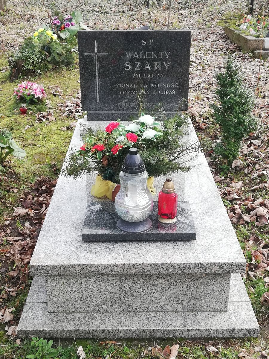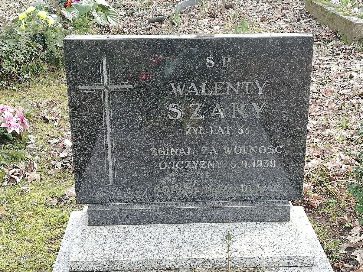 „Ś.P./ WALENTY/ SZARY/ ŻYŁ LAT 33/ ZGINĄŁ ZA WOLNOŚĆ/ OJCZYZNY 5.9.1939/ POKÓJ JEGO DUSZY”.