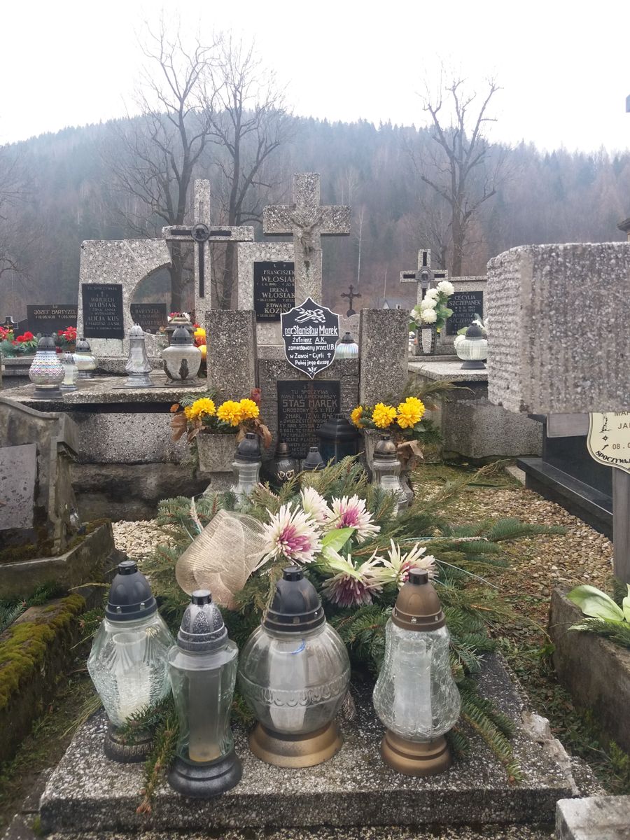 Pochowany w tym grobie Stanisław Marek ps. „Orlicz”, dowódca oddziału „Huragan”, poległ 12 lipca 1946 r. na polanie Sulowa Cyhrla w masywie Babiej Góry w walce z obława oddziału Wojsk Ochrony Pogranicza.