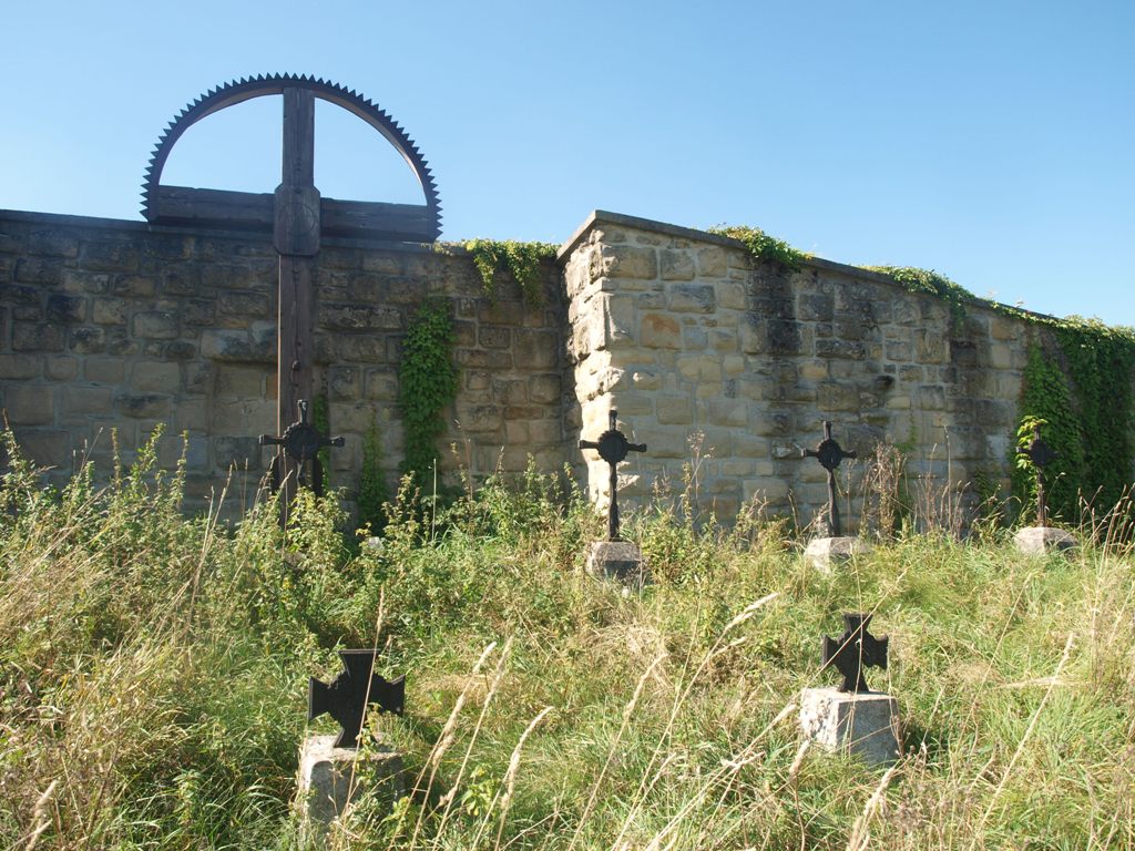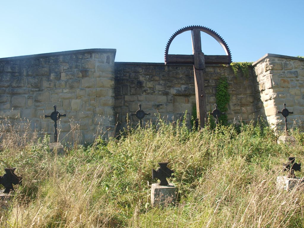 Na cmentarzu brakuje krzyży lotaryńskich na grobach żołnierzy armii rosyjskiej. Nie znajduje uzasadnienia obecność żeliwnych krzyż z motywem liści dębu, zaprojektowanych na groby żołnierzy armii niemieckiej. Według zachowanej dokumentach archiwalnych wizualizacji, prześwit w murze od strony frontowej, miał być wypełniony ogrodzeniem z drewnianych przęseł z jednoskrzydłową drewnianą furtką (GW 41, s. 1501).