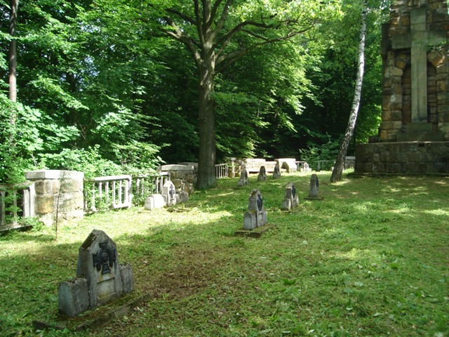 Na stelach znajdują się prostokątne nisze na tabliczki imienne oraz żeliwne krzyże: