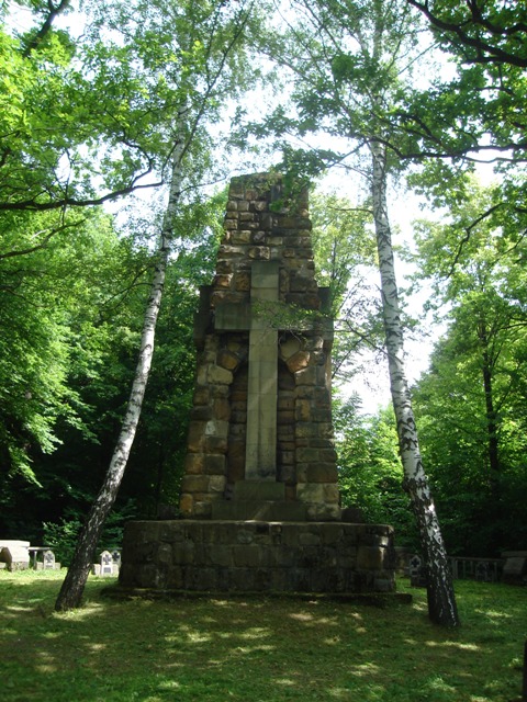 Głównym elementem cmentarza jest pomnik z ciosów kamiennych, w kształcie masywnego obelisku, na którego czterech ścianach znajdują się krzyże z kamiennych bloków.