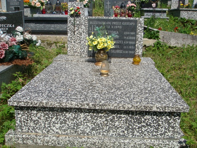 „ROZSTRZELANI PRZEZ GESTAPO / 23 X 1943 / Ś. P. / JAN TYLKA 13 IX 1900 / JAN PITOŃ 14 X 1898 / STANISŁAW STASZEL 6 IV 1908 / ANDRZEJ ZUBEK 11 I 1921 / STANISŁAW SKUBISZ 11 XI 1907 //”. Na lewo od steli umieszczono lastrykowy słup o przekroju prostokątnym z krzyżem łacińskim na licu.