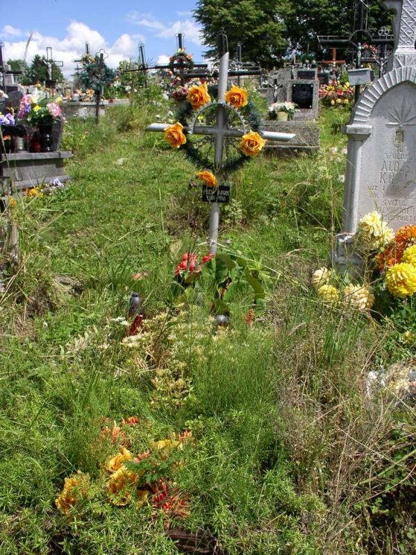 Mogiła ziemna z metalowym krzyżem i tabliczką z napisem memoratywnym. Pochowany tu Karol Pilch został zastrzelony przez żołnierzy radzieckich w lutym 1945 r.