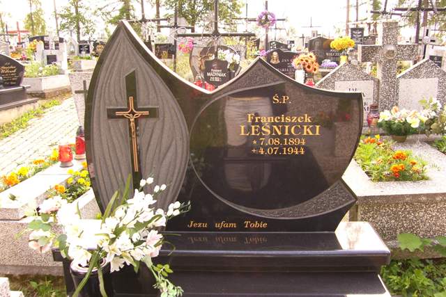 Grobowiec z czarnego, szlifowanego kamienia na podmurówce. U wezgłowia znajduje się stela o nieregularnym kształcie z czarnego, szlifowanego kamienia. W lewej części steli namalowany jest płomień, na tle któmieszczony jest krucyfiks z metalowych prętów. W prawej części steli napis memoratywny wykonany złoconymi literami: „Ś.P/ FRANCISZEK LEŚNICKI/ *7.08.1894/ 4.07.1944/” U podstawy steli napis: „Jezu ufam Tobie”.