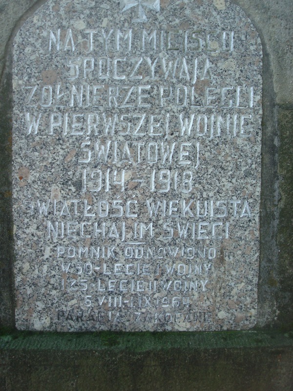 Pochowano tu 17 żołnierzy z armii austro-węgierskiej i jednego jeńca włoskiego zmarłych w okresie I wojny światowej. Ponadto na cmentarzu parafialnym spoczęły szczątki 16 polskich legionistów zmarłych, w okresie I wojny światowej, dla których po odzyskaniu niepodległości urządzona została osobna mogiła.