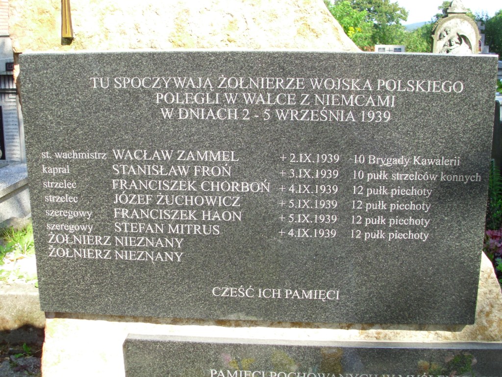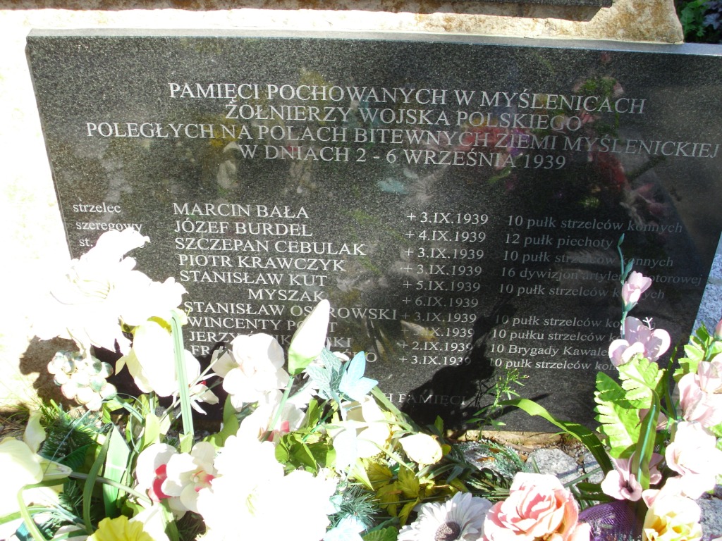 Na dolnej tablicy memoratywnej napis: PAMIĘCI POCHOWANYCH W MYŚLENICACH/ ŻOŁNIERZY WOJSKA POLSKIEGO/ POLEGŁYCH NA POLACH BITEWNYCH ZIEMI MYŚLENICKIEJ/ W DNIACH 2 – 6 WRZEŚNIA WRZEŚNIA 1939. Poniżej wymienione są dane 12 żołnierzy (stopień wojskowy, data śmierci, jednostka wojskowa).