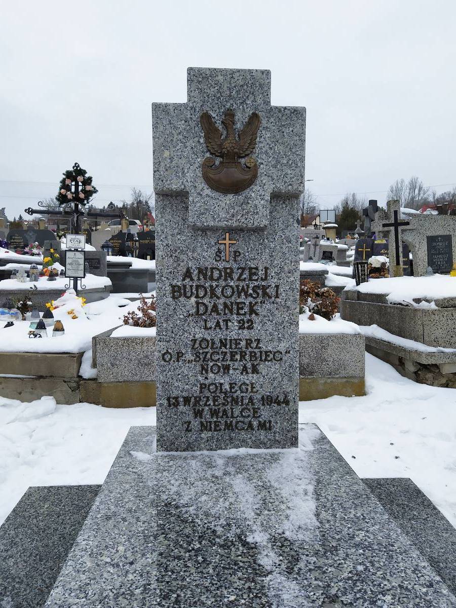 Na mogile nagrobek z szarego granitu z wysoką stelą u wezgłowia zakończoną ryzalitowanym równoramiennym krzyżem, na którym umieszczona jest metalowa plakieta przedstawiająca orła wojskowego. Na steli licu steli umieszczony jest napis wykonany z metalowych liter: Ś.†P./ ANDRZEJ/ BUDOWSKI/ „DANEK"/ LAT 22/ ŻOŁNIERZ/ O.P. „SZCZERBIEC"/ NOW–AK/ POLEGŁ/ 13 WRZEŚNIA 1944 R./ W WALCE/ Z NIEMCAMI.