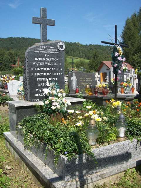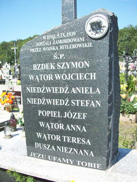 Mogiła ziemna o wymiarach 2,05 x 1,35 m, obramowana. U wezgłowia na przykrytym granitową płytą postumencie umieszczony jest głaz pamiątkowy w kształcie ściętego prostopadłościanu zwieńczony krzyżem łacińskim.. Na przedniej ścianie głazu znajduje się napis memoratywny: „W DNIU 5.IX.1939/ ZOSTALI ZAMORDOWANI/ PRZEZ WOJSKA HITLEROWSKIE/ Ś.P./ BZDEK SZYMON/ WĄTOR WOJCIECH/ NIEDŹWIEDŹ ANIELA/ NIEDŹWIEDŹ STEFAN/ POPIEL JÓZEF/ WĄTOR ANNA/ WĄTOR TERESA/ DUSZA NIEZNANA/ JEZU UFAM TOBIE”. W narożniku przedniej ściany głazu umieszczony jest metalowy medalion z głową Chrystusa.
