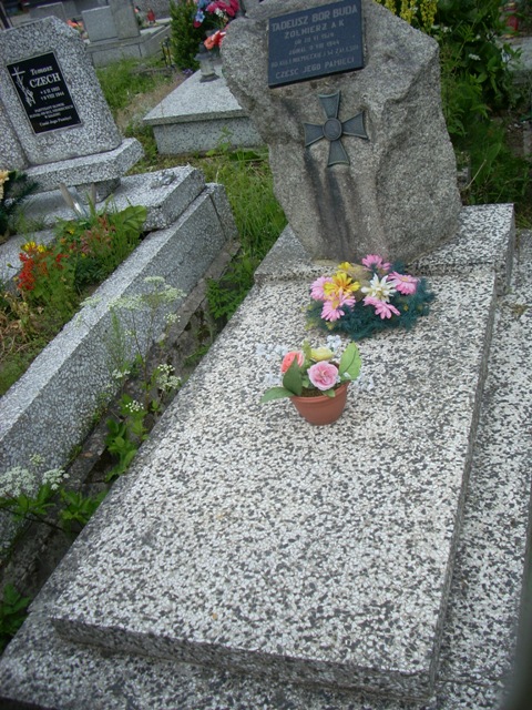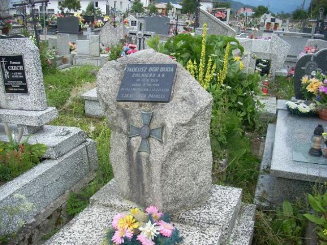Mogiła obramowana i nakryta lastrykową płytą. U wezgłowia umieszczony jest głaz z tablicą memoratywną z napisem: „TADEUSZ BOR BUDA/ ŻOŁNIERZ AK/ UR. 20 VI 1924/ ZGINĄŁ 9 VIII 1944/ OD KULI NIEMIECKIEJ W ZALESIU/ CZEŚĆ JEGO PAMIĘCI”. Poniżej tablicy do głazu przymocowany jest metalowy krzyż maltański z okrągłą tarczą na skrzyżowaniu ramion.
