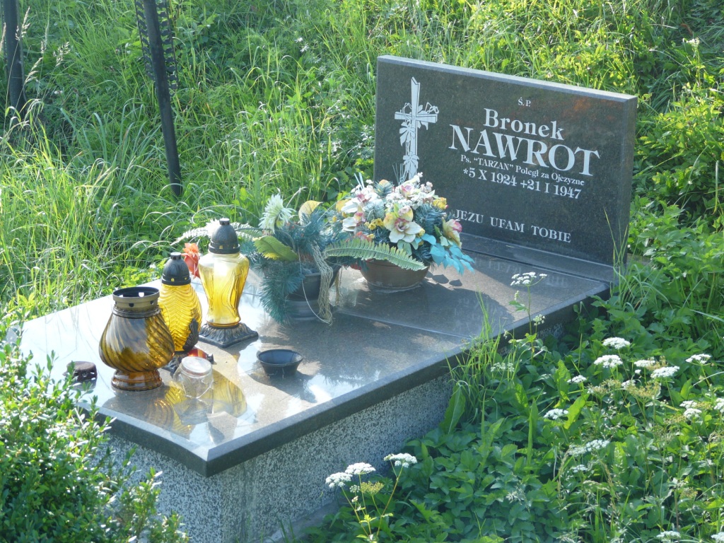 Mogiła w lastrykowym obramowaniu, nakryta ciemną, kamienną płytą. U wezgłowia prostokątna stela z napisem „Ś.P./ Bronek NAWROT/ Ps. „TARZAN” Poległ za Ojczyzne/ *5 X 1924 +21 I 1947/ JEZU UFAM TOBIE”.