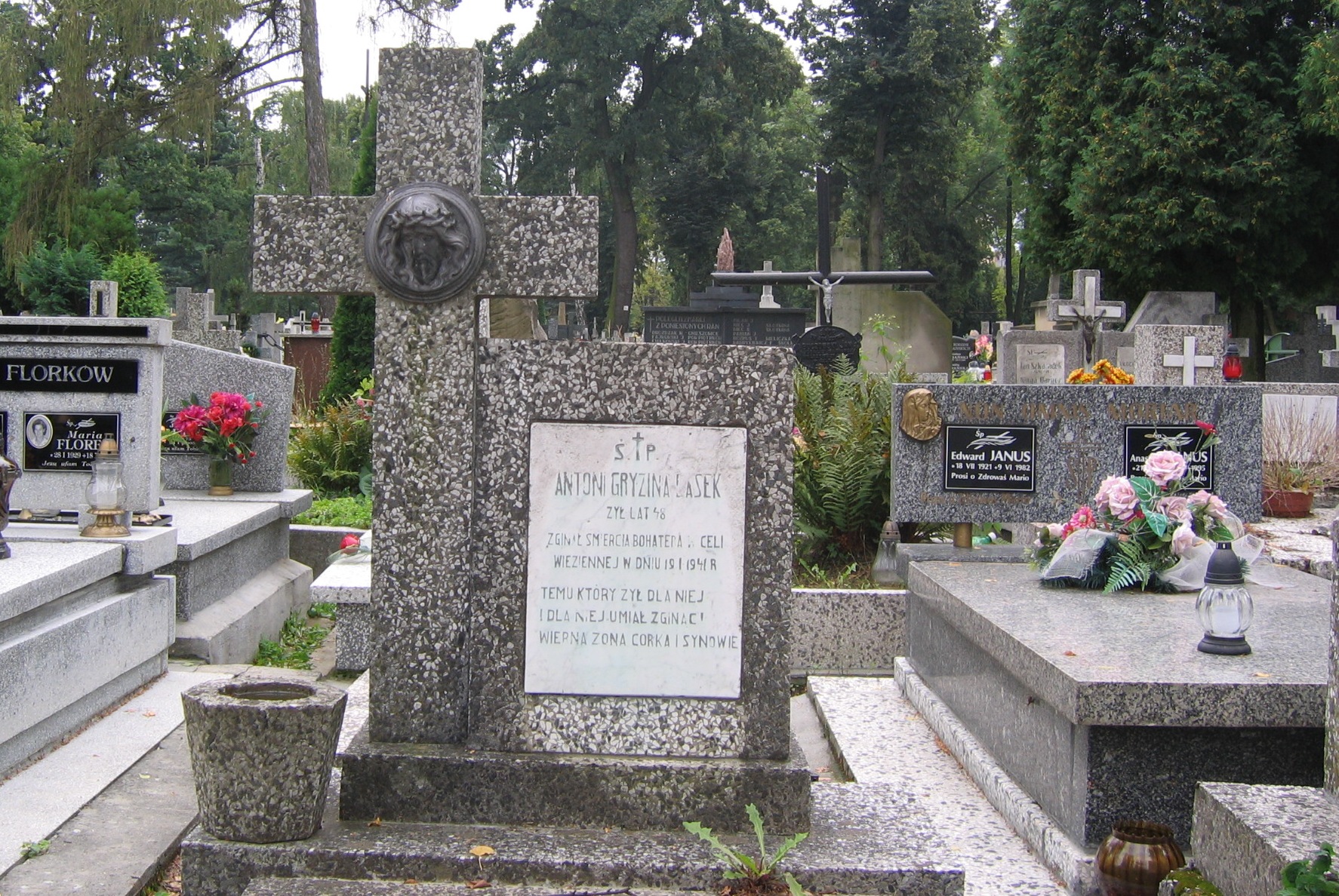 Mogiła obramowana i nakryta lastrykową płytą, u wezgłowia lastrykowy krzyż z metalowym medalionem przedstawiającym wizerunek głowy Chrystusa oraz lastrykowa stela z tablicą memoratywną z napisem: „Ś.†P./ ANTONI GRYZINA-LASEK/ ŻYŁ LAT 46/ ZGINĄŁ ŚMIERCIĄ BOHATERA W CELI/ WIĘZIENNEJ W DNIU 19 I 1941/ TEMU KTÓRY ŻYŁ DLA NIEJ/ I DLA NIEJ UMIAŁ ZGINĄĆ/ WIERNA ŻONA CÓRKA I SYNOWIE”.