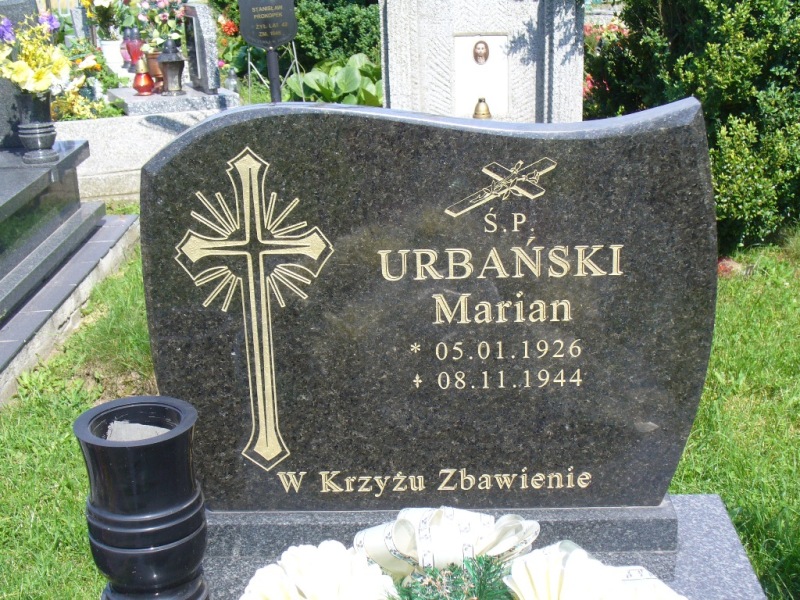 Nagrobek z ciemnego kamienia. U wezgłowia stela o falistych krawędziach. Na steli wyryty jest krzyż oraz napis: „Ś.P./ URBAŃSKI/ MARIAN/ * 05.01.1926/ † 08.11.1944”