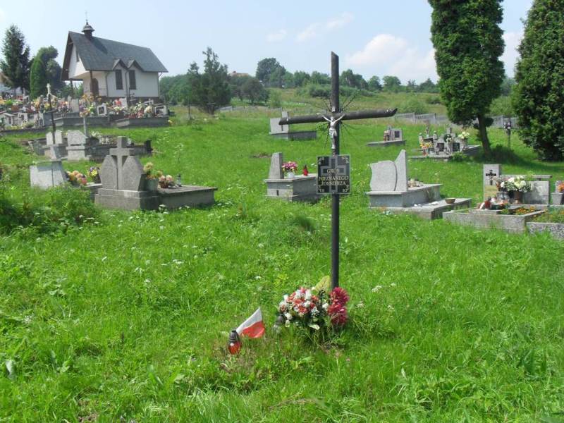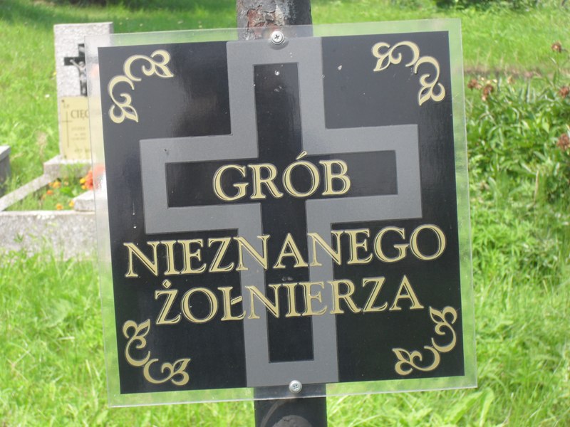 Mogiła ziemna, oznaczona krzyżem z metalowych rur z tabliczką z napisem „GRÓB/ NIEZNANEGO/ ŻOŁNIERZA”.