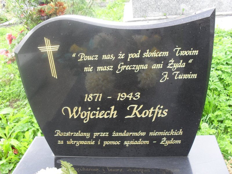 Nagrobek wykonany z ciemnego granitu. U wezgłowia stela z falowanymi krawędziami i wyrytym krzyżem oraz napisem: „Poucz nas, że pod słońcem Twoim, nie masz Greczyna ani Żyda/ J. Tuwim/ 1871 – 1943/ Wojciech Kotfis/ Rozstrzelany przez żandarmów niemieckich/ za ukrywanie i pomoc sąsiadom – Żydom”.
