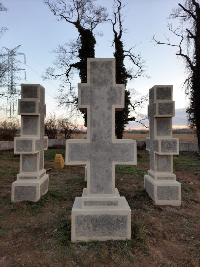 Der Friedhof ist auf einer Ellipse angelegt und von einer Betonmauer umgeben. Der Eingang auf der Westseite ist mit einem zweiflügeligen Tor aus Eisenstäben verschlossen. Das Hauptelement des Friedhofs sind vier massive zweiarmige Betonkreuze, die einander gegenüberstehen und im zentralen Teil des Friedhofs aufgestellt sind.