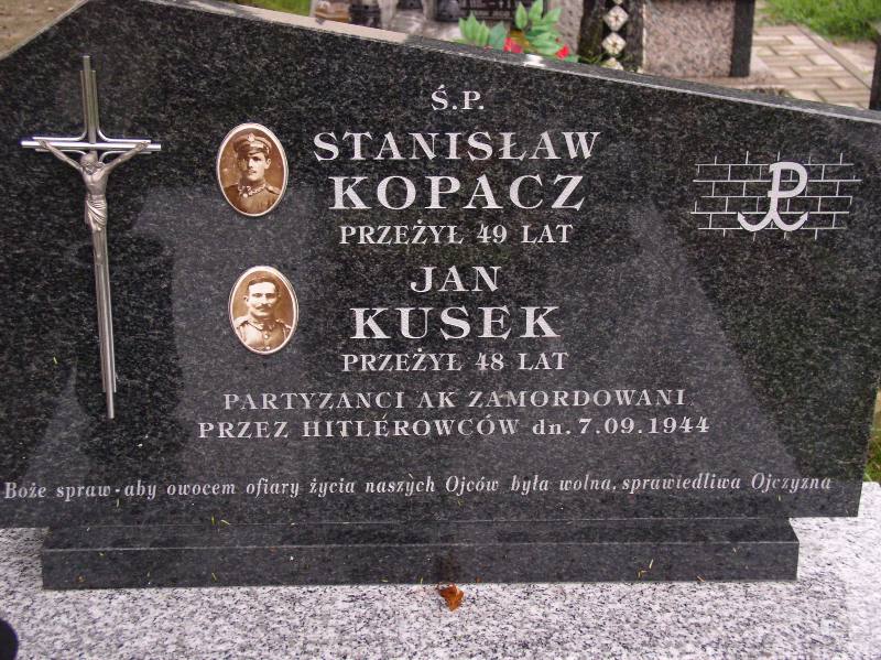 Na mogile znajduje się nagrobek wykonany z jasnego granitu. U wezgłowia mogiły umieszczona jest stela w kształcie niesymetrycznego pięcioboku. Na licu steli znajdują się: metalowy krzyż z figurą Chrystusa, dwa owalne medaliony z fotografiami pochowanych, symbol „Polski Walczącej” oraz napis „Ś.P./ STANISŁAW KOPACZ/ PRZEŻYŁ 49 LAT/ JAN KUSEK/ PRZEŻYŁ 48 LAT/ PARTYZANCI AK ZAMORDOWANI/ PRZEZ HITLEROWCÓW dn. 7.09.1944/ Boże spraw – aby owocem ofiary życia naszych Ojców była wolna, sprawiedliwa Ojczyzna”.
