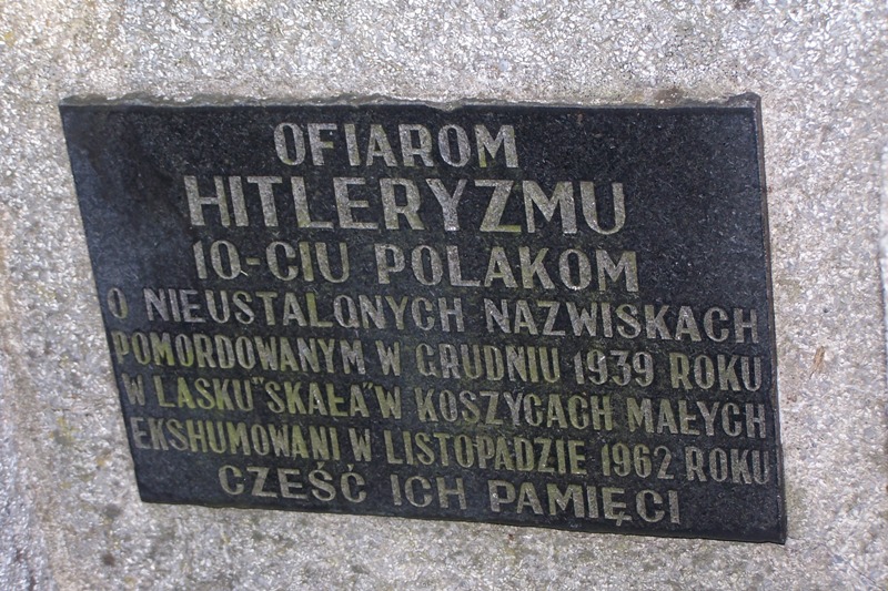 – „OFIAROM/ HITLERYZMU/ 10-CIU POLAKOM/ O NIEUSTALONYCH NAZWISKACH/ POMORDOWANYM W GRUDNIU 1939 ROKU/ W LASKU „SKAŁA” W KOSZYCACH MAŁYCH/ EKSHUMOWANI W LISTOPADZIE 1962 ROKU/ CZEŚĆ ICH PAMIĘCI”.