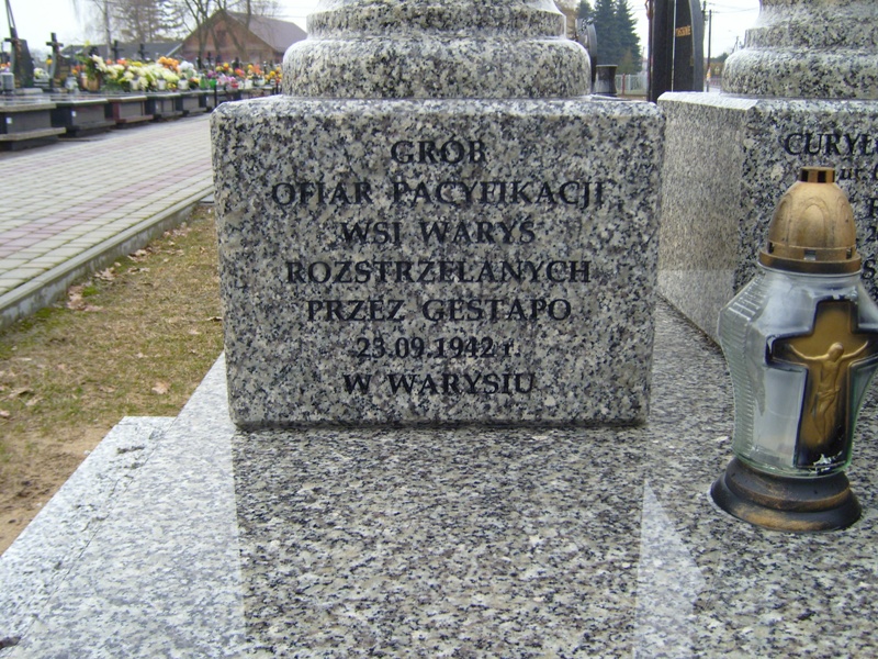 – „GRÓB/ OFIAR PACYFIKACJI/ WSI WARYŚ/ ROZSTRZELANYCH/ PRZEZ GESTAPO/ 23.09.1942 r./ W WARYSIU” (lewa kolumna),