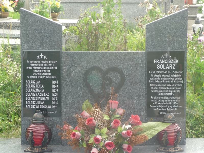 – „Ś.†P./ Tu spoczywa rodzina Solarzy/ rozstrzelana 6.III.1944 r./ przez Niemców za działalność/ antyhitlerowską/ w Armii Krajowej/ w okresie II wojny światowej/ SOLARZ JAN LAT 64/ SOLARZ TEKLA LAT 49/ SOLARZ MARIA LAT 30/ SOLARZ KAZIMIERZ LAT 20/ SOLARZ STANISŁAW LAT 18/ SOLARZ JULIAN LAT 14/ SOLARZ WŁADYSŁAW LAT 11/ CZEŚĆ ICH PAMIĘCI”