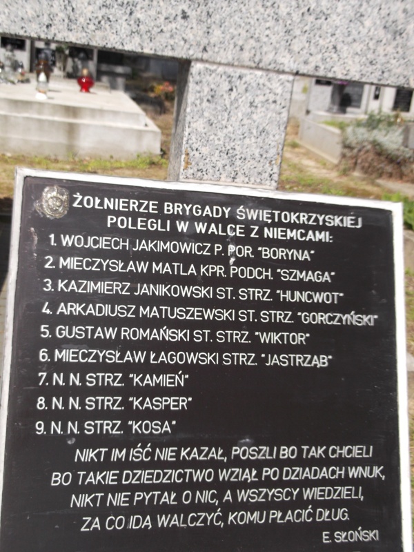 U wezgłowia mogiły umieszczony jest krzyż z bloków jasnego kamienia z czarną tabliczką z napisem: „ŻOŁNIERZE BRYGADY ŚWIĘTOKRZYSKIEJ/ POLEGLI W WALCE Z NIEMCAMI:/ 1. WOJCIECH JAKIMOWICZ P.POR. „BORYNA/ 2. MIECZYSŁAW MATLA KPR. PODCH. „SZMAGA”/ 3. KAZIMIERZ JANIKOWSKI ST. STRZ. „HUNCWOT”/ 4. ARKADIUSZ MATUSZEWSKI\ ST. STRZ. „GORCZYŃSKI”/ 5. GUSTAW ROMAŃSKI ST. STRZ. „WIKTOR”/ 6. MIECZYSŁAW ŁAGOWSKI STRZ. „JASTRZĄB”/ 7. N.N. STRZ. „KAMIEŃ”/ 8. N.N. STRZ. „KASPER”/ 9. N.N. STRZ. „KOSA”/ NIKT IM IŚĆ NIE KAZAŁ, POSZLI BO TAK CHCIELI/ BO TAKIE DZIEDZICTWO WZIĄŁ PO DZIADACH WNUK/ NIKT NIE PYTAŁ O NIC, A WSZYSCY WIEDZIELI, / ZA CO IDĄ WALCZYĆ, KOMU PŁACIĆ DŁUG/ E. SŁOŃSKI/ W HOŁDZIE ŻOŁNIERZOM ZWIĄZEK N.S.Z.