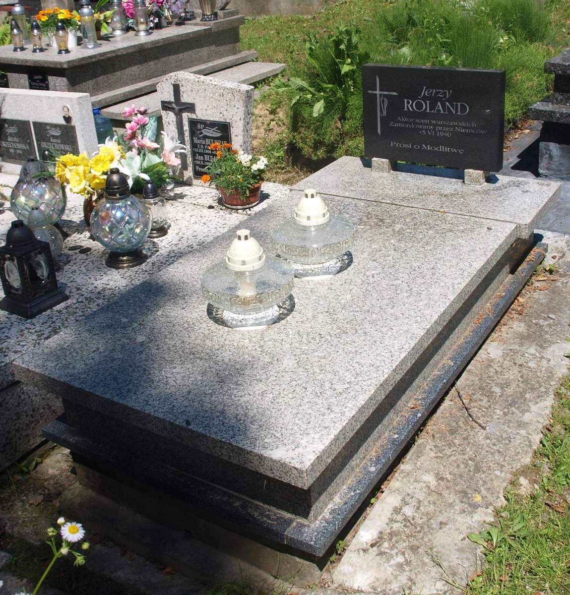 Nagrobek wykonany z jasnego granitu. U wezgłowia ciemna prostokątna stela z napisem memoratywnym: „Jerzy/ ROLAND/ Aktor scen warszawskich./ Zamordowany przez Niemców/ +5 VI 1940/ Prosi o Modlitwę”.