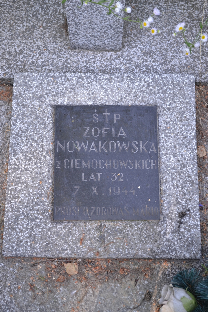 Na mogile znajduje się lastrykowy nagrobek z krzyżem łacińskim u wezgłowia i tablicą z ciemnego kamienia z napisem: „Ś.†P./ ZOFIA/ NOWAKOWSKA/ z CIEMIOCHOWSKICH/ LAT 32/ 7.X.1944/ PROSI O ZDROWAŚ MARIO”.