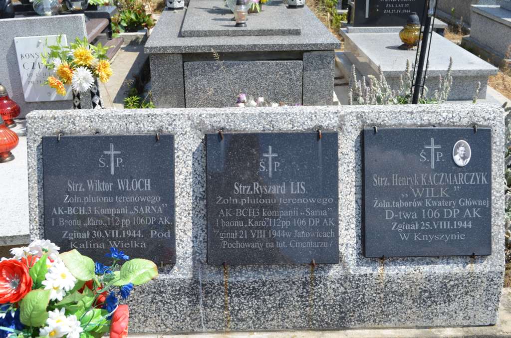 – obramowanie nr 3: „Ś.†P./ Strz. Henryk KACZMARCZYK/ „WILK”/ Żołn. Taborów Kwatery Głównej/ D-twa 106 DP AK/ Zginął 25.VIII.1944/ W Knyszynie”, „Ś.†P./ Strz. Ryszard LIS/ Żołn. plutonu terenowego/ AK BCH 3 kompanii „Sarna”/ I baonu „Karo” 112 pp 106 DP AK/ zginął 21 VIII 1944 w Janowicach/ Pochowany na tut. Cmentarzu”, „Ś.†P./ Strz. Wiktor WŁOCH/ Żołn. plutonu terenowego/ AK-BCH.3 Kompanii „SARNA”/ I Baonu „Karo,, 112 pp 106 DP AK/ Zginął 30.VII.1944. Pod/ Kaliną Wielką”;