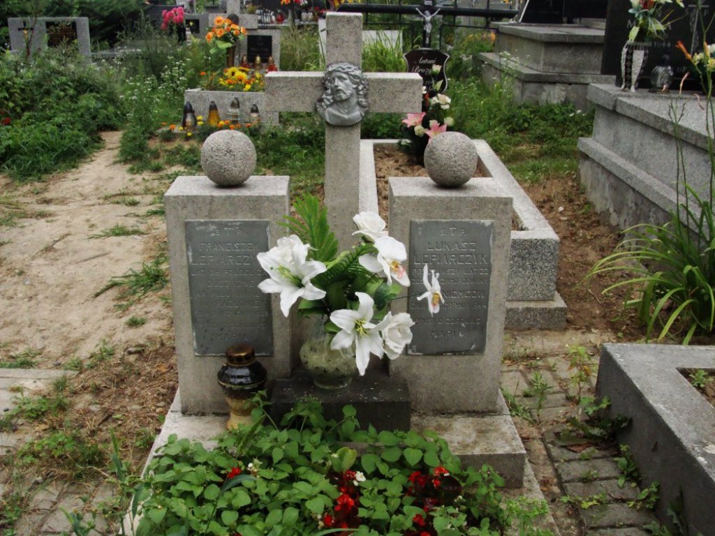 – „Ś.†P./ ŁUKASZ/ LEPIARCZYK/ PRZEŻYWSZY LAT 22/ ZOSTAŁ ZAMORDOWANY/ PRZEZ NIEMCÓW/ DNIA 15. SIERPNIA 1944./ PROSI O ZDROWAŚ/ MARIA.”