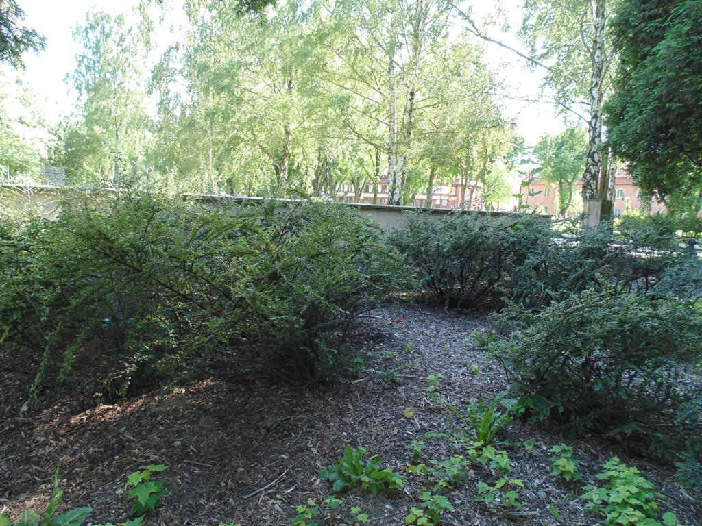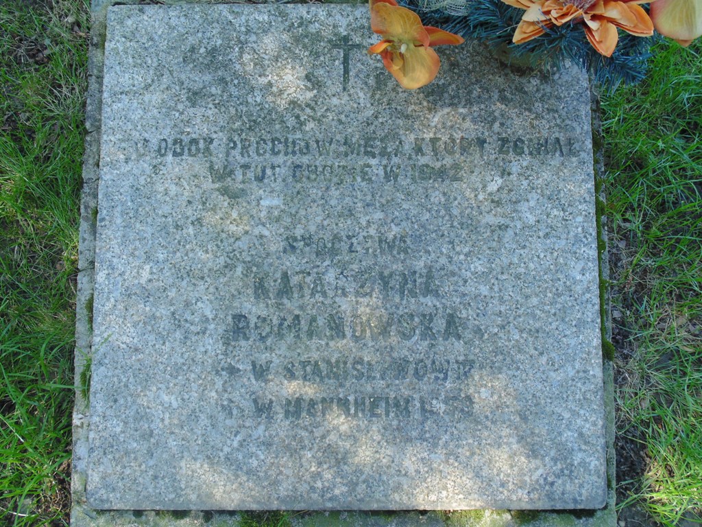 Wnętrze urządzone jest w formie pasu zieleni obsadzonego bukszpanem, biegnącego wzdłuż ogrodzenia oraz skweru na planie prostokąta, oddzielonych od siebie utwardzoną alejką. Na środkowym skwerze, obsadzonym trawą i żywotnikiem, umieszczona jest granitowa płyta nagrobna z metalowym krzyżem u wezgłowia i napisem: „†/ OBOK PROCHÓW MĘŻA, KTÓRY ZGINĄŁ/ W TUT. OBOZIE W 1942/ SPOCZYWA/ KATARZYNA/ ROMANOWSKA/* W STANISŁAWOWIE/ † MANNHEIM 1979”.