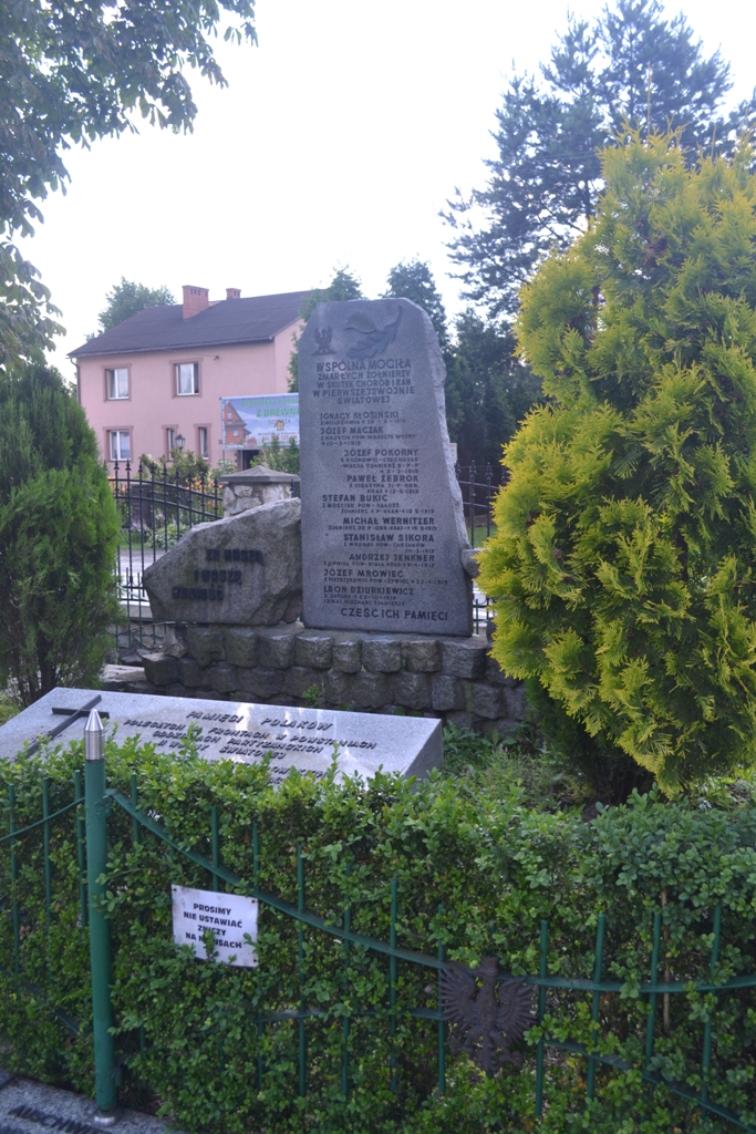 Na głazie pamiątkowym znajduje się napis z metalowych liter: „ZA NASZĄ/ I WASZĄ/ WOLNOŚĆ”. Na steli umieszczone są dwie metalowe plakietki w formie orła w koronie i liścia oraz napis: „WSPÓLNA MOGIŁA/ ZMARŁYCH ŻOŁNIERZY/ W SKUTEK CHORÓB I RAN/ W PIERWSZEJ WOJNE/ ŚWIATOWEJ/ IGNACY KŁOSIŃSKI/ Z WOLBROMIA + 28- 2-1915/ JÓZEF MACZAK / Z HRUSTIN POW. WANESTE WĘGRY/ +10-3-1915/ JÓZEF POKORNY/ Z ROŻNOWIC – CZECHOSŁO/ -WACJA ŻOŁNIERZ 8 P.P./ + 2-3-1915/ PAWEŁ ŻEBROK/ Z CIESZYNA 31 P. OBR./ KRAJ + 12-5-1915/ STEFAN BUKIC/ Z MOŚCISK POW – KAŁUSZ/ ŻOŁNIERZ 4 P. UŁAN – 13 5 – 1915/ MICHAŁ WERNITZER/ ŻOŁNIERZ 32 P. OBR. KRAJ - + 16 5-1915/ STANISŁAW SIKORA/ Z WODNEJ POW – CHRZANÓW/ 30-3-1919/ ANDRZEJ JENKNER/ Z LIPNIKA POW – BIAŁA KRAK +3-4-1919/ JÓZEF MROWIEC/ Z PIETRZYKOWIC POW. ŻYWIEC + 22-4-1919/ LEON DZIURKIEWICZ/ Z ZATORA + 22-10-1919/ I DWAJ NIEZNANI ŻOŁNIERZE/ CZEŚĆ ICH PAMIĘCI”. Po prawej stronie steli znajduje się kamienna donica.