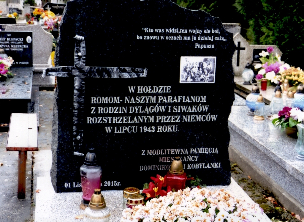>> "Kto was widzi, ten wojny się nie boi/ bo znowu w oczach ma ją dzisiaj całą" PAPUSZA/ W HOŁDZIE/ ROMOM - NASZYM PARAFIANOM Z RODZIN DYLĄGÓW I SIWAKÓW/ ROZSTRZELANYM PRZEZ NIEMCÓW/ W LIPCU 1943 ROKU./ Z MODLITEWNĄ PAMIĘCIĄ/ MIESZKAŃCY/ DOMINIKOWIC i KOBYLANKA/ 01 Listopada 2015r. << Na steli umieszczony jest motywe krzyża i zdjęcie rodziny romskiej.