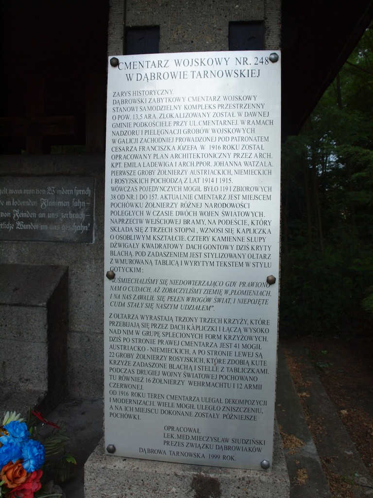 Na jednym z filarów kaplicy umieszczona jest tablica z napisem: „CMENTARZ WOJSKOWY NR. 248 W DĄBROWIE TARNOWSKIEJ ZARYS HISTORYCZNY. DĄBROWSKI ZABYTKOWY CMENTARZ WOJSKOWY STANOWI SAMODZIELNY KOMPLEKS PRZESTRZENNY O POW. 13,5 ARA. ZLOKALIZOWANY ZOSTAŁ W DAWNEJ GMINIE PODKOŚCIELE PRZY UL. CMENTARNEJ. W RAMACH NADZORU I PIELĘGNACJI GROBÓW WOJSKOWYCH W GALICJI ZACHODNIEJ PROWADZONEJ POD PATRONATEM CESARZA FRANCISZKA JÓZEFA W 1916 ROKU ZOSTAŁ OPRACOWANY PLAN ARCHITEKTONICZNY PRZEZ ARCH. KPT. EMILA LADEWIGA I ARCH. PPOR. JOHANNA WATZALA. PIERWSZE GROBY ŻOŁNIERZY AUSTRIACKICH, NIEMIECKICH I ROSYJSKICH POCHODZĄ Z LAT 1914 I 1915. WÓWCZAS POJEDYNCZYCH MOGIŁ BYŁO 119 I ZBIOROWYCH 38 od NR. 1 DO 157 AKTUALNIE CMENTARZ JEST MIEJSCEM POCHÓWKU ŻOŁNIERZY RÓŻNEJ NARODOWOŚCI POLEGŁYCH W CZASIE DWÓCH WOJEN ŚWIATOWYCH. NAPRZECIW WEJŚCIOWEJ BRAMY, NA PODEŚCIE, KTÓRY SKŁADA SIĘ Z TRZECH STOPNI, WZNOSI SIĘ KAPLICZKA O OSOBLIWYM KSZTAŁCIE. CZTERY KAMIENNE SŁUPY DŹWIGAŁY KWADRATOWY DACH GONTOWY DZIŚ KRYTY BLACHĄ. POD ZADASZENIEM JEST STYLIZOWANY OŁTARZ Z WMUROWANĄ TABLICĄ I WYRYTYM TEKSTEM W STYLU GOTYCKIM: „UŚMIECHALIŚMY SIĘ NIEDOWIERZAJĄCO GDY PRAWIONO NAM O CUDACH, AŻ ZOBACZYLIŚMY ZIEMIĘ W PŁOMIENIACH, I NA NAS ZAWALIŁ SIĘ PEŁEN WROGÓW ŚWIAT, I NIEPOJĘTE CUDA STAŁY SIĘ NASZYM UDZIAŁEM”. Z OŁTARZA WYRASTAJĄ TRZONY TRZECH KRZYŻY, KTÓRE PRZEBIJAJĄ SIĘ PRZEZ DACH KAPLICZKI I ŁĄCZĄ WYSOKO NAD NIM W GRUPĘ SPLECIONYCH FORM KRZYŻOWYCH. DZIŚ PO STRONIE PRAWEJ CMENTARZA JEST 41 MOGIŁ AUSTRIACKO-NIEMIECKICH, A PO STRONIE LEWEJ SĄ 22 GROBY ŻOŁNIERZY ROSYJSKICH, KTÓRE ZDOBIĄ KUTE KRZYŻE ZADASZONE BLACHĄ I STELLE Z TABLICZKAMI. PODCZAS DRUGIEJ WOJNY ŚWIATOWEJ POCHOWANO TU RÓWNIEŻ 16 ŻOŁNIERZY WEHRMACHTU I 12 ARMII CZERWONEJ. OD 1916 ROKU TEREN CMENTARZA ULEGAŁ DEKOMPOZYCJI I MODERNIZACJI. WIELE MOGIŁ ULEGŁO ZNISZCZENIU, A NA ICH MIEJSCU DOKONANE ZOSTAŁY PÓŹNIEJSZE POCHÓWKI. OPRACOWAŁ LEK.MED. MIECZYSŁAW SIUDZIŃSKI PREZES ZWIĄZKU DĄBROWIAKÓW DĄBROWA TARNOWSKA 1999 ROKU”.