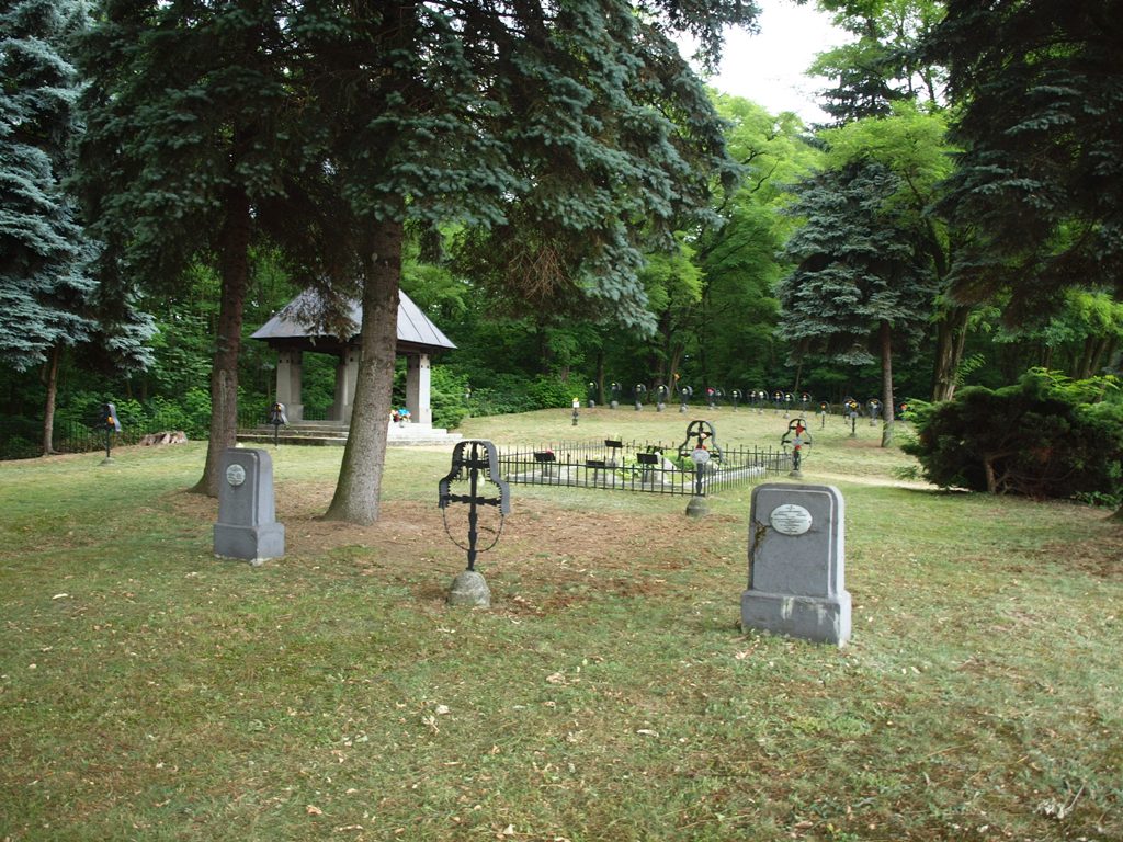 – żelaznych, dwuramiennych krzyży o drzewcu z motywem roślinnym, o ramionach połączonych od góry zadaszeniem z ząbkowanej blachy, a od dołu żelaznym prętem z kulkowymi wzmocnieniami, osadzonych na zakończonych półkuliście cokolikach (typ Э),